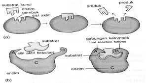 Cara kerja enzim dapat dijelaskan dengan dua teori, yaitu teori gembok dan anak kunci, dan teori kecocokan yang terinduksi. Jadi, yang punya gembok per untuk mengamamkan sesuatu. Sisi aktif enzim mempunyai bentuk tertentu yang hanya sesuai untuk satu jenis substrat saja gambar 3.4 a) substrat sesuai dengan sisi aktif seperti gembok kunci dengan anak kuncinya. Hubungan antara enzim dengan substrat.